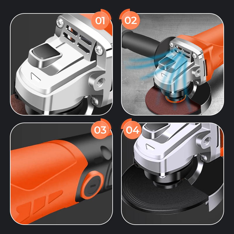 360° AIRFLOW COOLING SYSTEM FOR SUSTAINED OPERATION: The angle grinder incorporates a multidirectional ventilation design with a large-diameter fan to prevent overheating. This cooling mechanism extends tool life by maintaining optimal motor temperature during extended use, while also reducing dust accumulation for better maintenance.