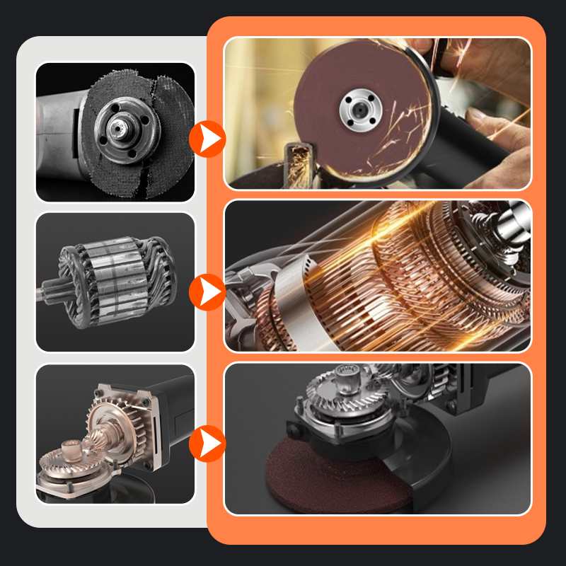 HIGH-POWER PURE COPPER MOTOR FOR ENHANCED DURABILITY: Equipped with a robust pure copper motor, this grinder delivers consistent power output while resisting overheating. The motor's advanced design includes overload protection, ensuring long-lasting performance even during intensive use on tough materials like metal and stone.