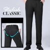 An expandable waist guarantees a perfect fit in these classic-fit dress pants with flat-front styling.